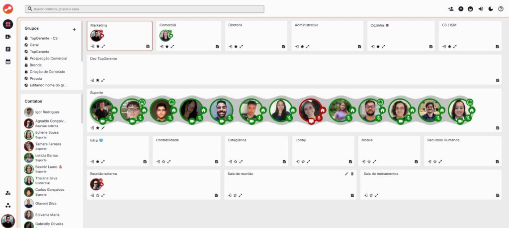 O dashboard visual Proseia foi projetado para oferecer visibilidade total da equipe em uma única tela. Assim, os gestores e colaboradores conseguem identificar rapidamente quem está disponível, quais salas estão ativas e quem está em reunião, tudo de forma intuitiva.